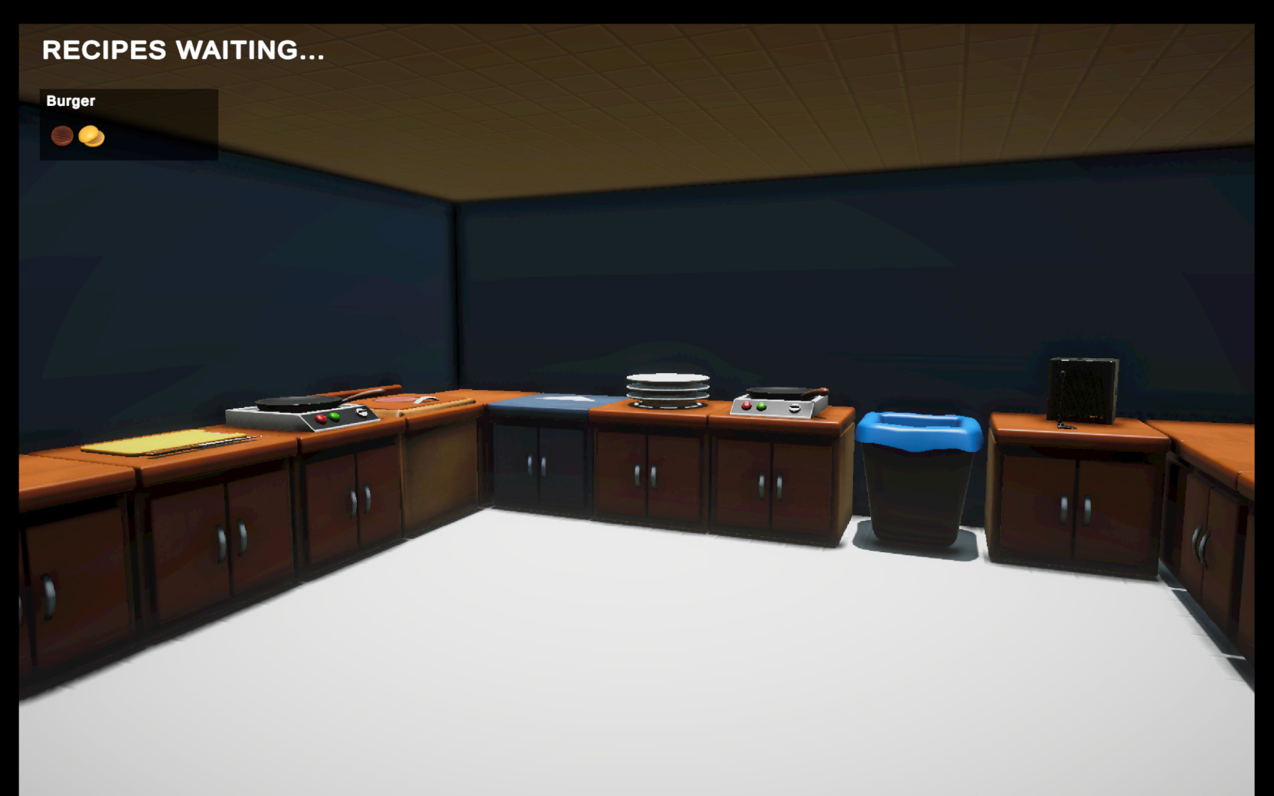you need to interact (E) with the counter with microphone and speaker to take an order. complete the recipe you get on top left corner, put it on a plate and deliver it to the delivery counter.